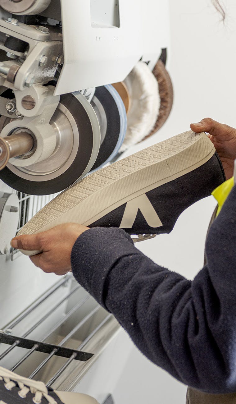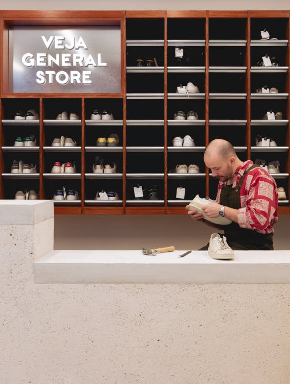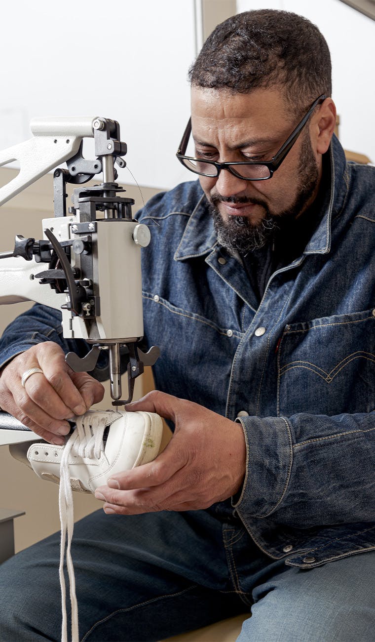 En 2023, VEJA le pidió a uno de nuestros zapateros, Walter, que creara un modelo utilizando los desperdicios de cuero de VEJA para Dover Street Market Ginza en Japón.