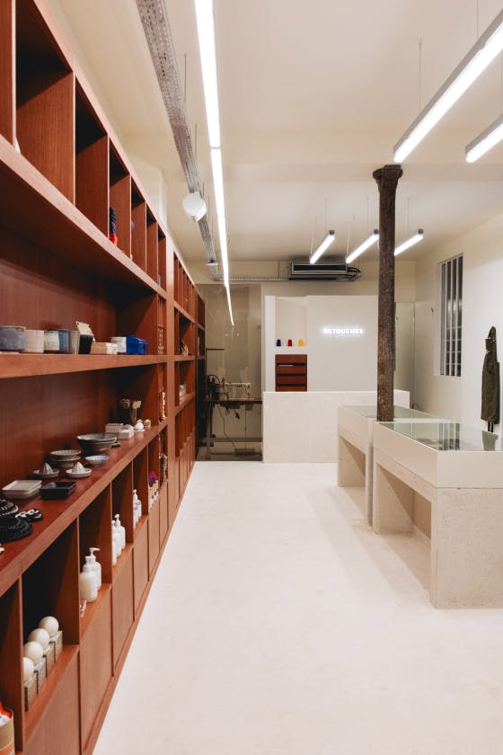 Para el diseño de la tienda, los equipos de VEJA trabajaron codo a codo con un equipo de jóvenes arquitectos franceses de Alors Studio. Crearon un interior minimalista y cálido mezclando madera, hormigón, acero y vidrio. Además, el espacio funciona con energía renovable suministrada por Enercoop.