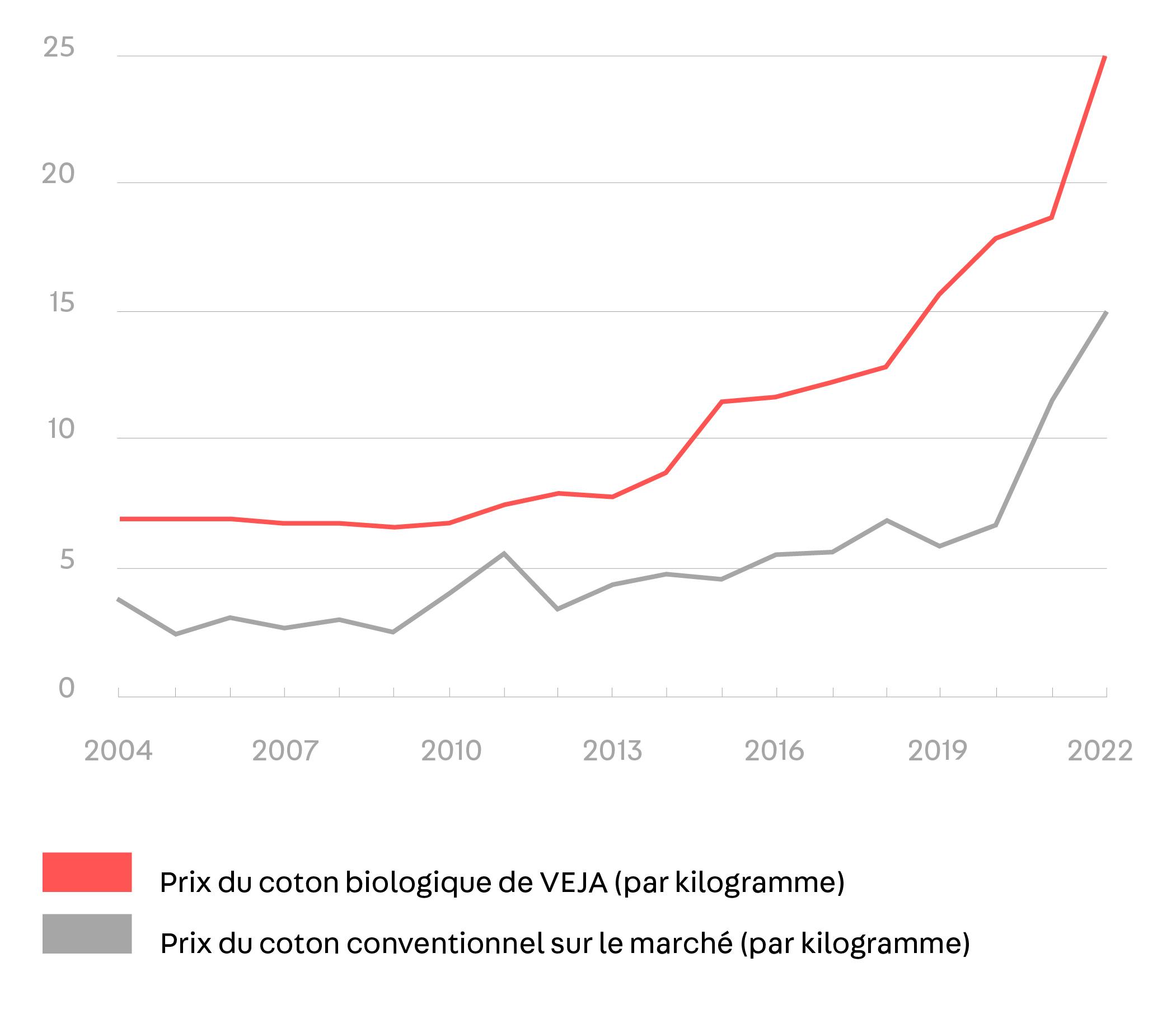 Le prix du coton biologique est déterminé à l'avance avec les producteurs. VEJA établit un contrat de deux ans garantissant l'achat de leur coton bio à un prix fixé en amont. Cela leur permet d'avoir une visibilité sur les 2 ou 3 récoltes à venir et d'éviter l'un des problèmes majeurs de l'agriculture mondiale : quand un producteur plante une graine de coton, il ne sait pas à combien il vendra le kilo de coton issu de cette graine.