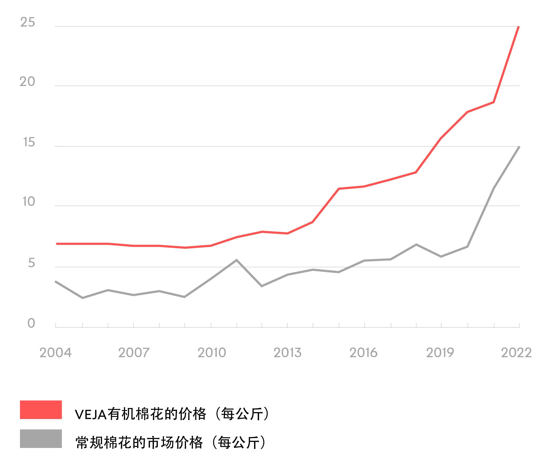 有机棉的价格与生产者提前确定。VEJA签订了一个为期两年的合同,保证以预先确定的价格购买他们的有机棉。这使他们能够对接下来的2到3次收获有所预期,避免了全球农业的一个主要问题:当生产者种植棉籽时,他们不知道这颗棉籽产出的棉花每公斤能卖多少钱。